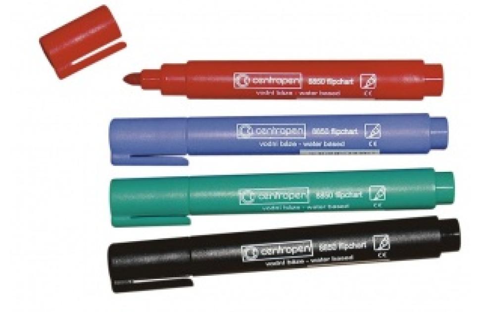 Marker is designed for writing on a paper, especially on flipchart paper boards. High resistance to drying of ink on a tip. An opened marker will work during one week. Water-based ink is not leaking though paper, it has no smell. Cylindrical tip. New markers of modern design with ventilated cap have fibre tips resistant to pressing. High-capacity cartridge, high resistance to drying. All materials used in production fulfil the health requirements.