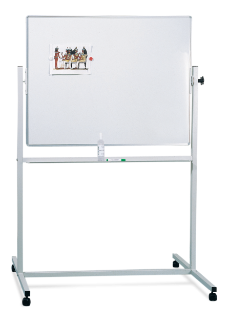 Double board surface. You can simply tilt the board into a wanted position and fix it. It has a large rack for stationery, magnets and other means. The rack travels on metal construction and has wheels with brake. Boards are intalled in aluminium frames finished by natural elox with rounded plastic corners of gray colour. Magnetic surface may be:
