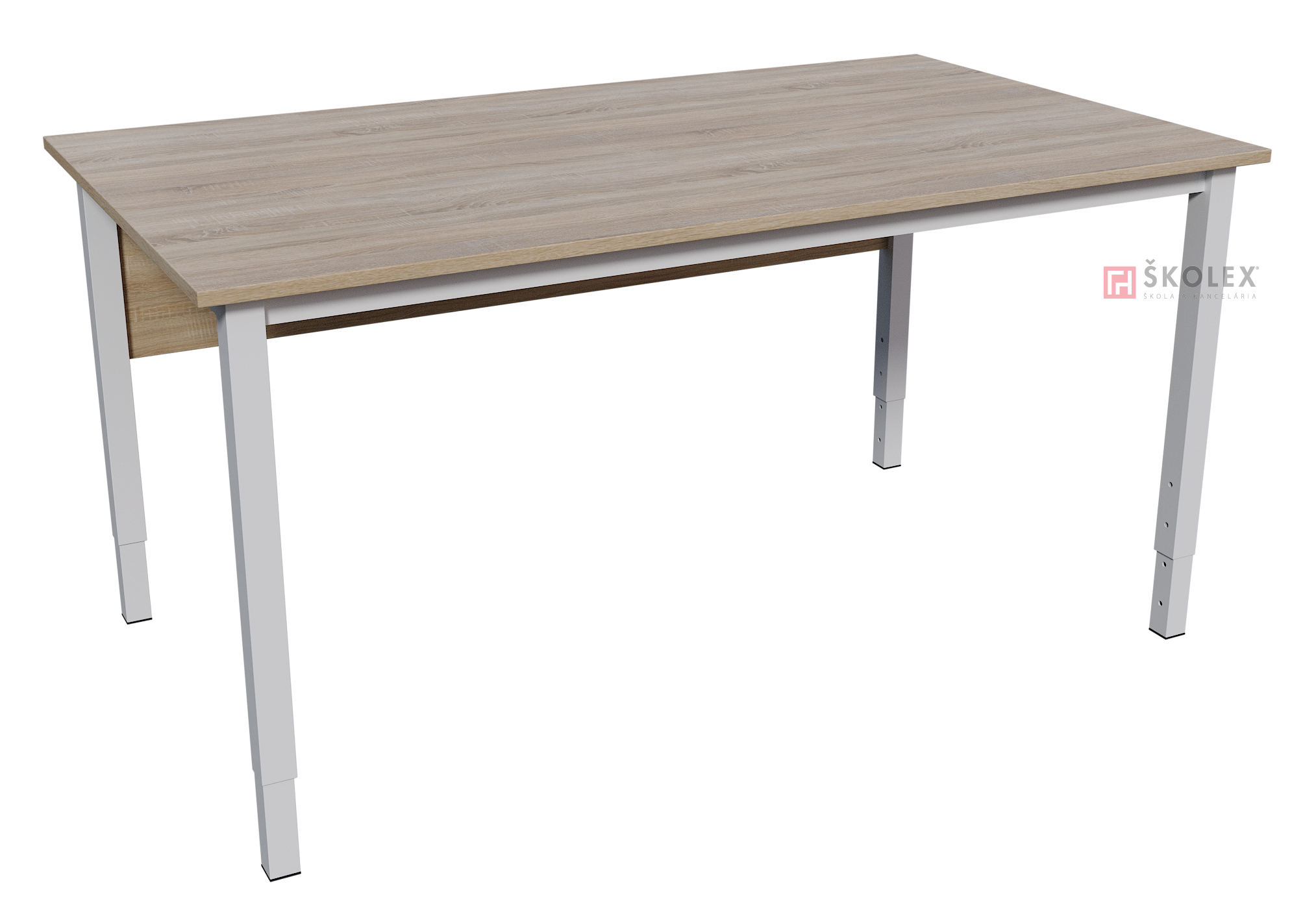 Moderný výškovo nastaviteľný stôl obdĺžnikového formátu 140x80 cm s krycou doskou podnož z joklového profilu, povrchovo upravená vypalovanou práškovou farbou (výber z RAL vzorkovníka), laminovaná drevotriesková doska hr. 18mm, rôznych dezénov (výber zo vzorkovníka "Farba dosky"). Výškové nastavenie 580mm - 820mm (veľ. 3 - 7). Vhodný ako žiacke pracovisko aj katedra. Záruka 2 roky.