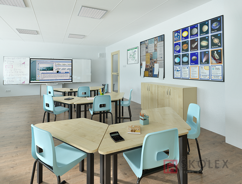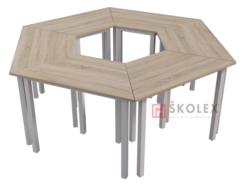 Moderný stôl lichobežníkového formátu 100x50 cm výškovo pevný, podnož z joklového profilu, povrchovo upravená vypalovanou práškovou farbou (výber z RAL vzorkovníka), laminovaná drevotriesková doska hr. 18mm, rôznych dezénov (výber zo vzorkovníka "Farba dosky"). Dostupný vo veľkostiach 3, 4, 5, 6. Vhodný pre skupinové riešenie úloh alebo usporiadanie stolov do "hniezd". Záruka 2 roky.