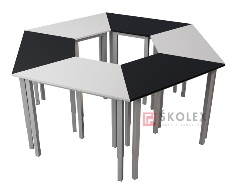 Moderný výškovo nastaviteľný stôl lichobežníkového ormátu 100x50 cm, podnož z joklového profilu, povrchovo upravená vypalovanou práškovou farbou (výber z RAL vzorkovníka), laminovaná drevotriesková doska hr. 18mm, rôznych dezénov (výber zo vzorkovníka "Farba dosky"). Výškové nastavenie 580mm - 820mm (veľ. 3 - 7). Vhodný pre skupinové riešenie úloh alebo usporiadanie stolov do "hniezd". Záruka 2 roky.