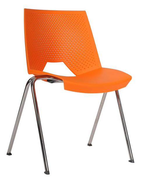 Moderná plastová stolička lastúrového tvaru, oceľová chrómovaná konštrukcia, možnosť stohovania (max. 10 kusov). Výška sedu 45cm. Odtiene plastov: modrá P 71, sivá P 72, oranžová P73, čierna P 74, červená P 75, piesková P76, zelená P 77, biela P 78. Nosnosť 120 kg, záruka 36 mesiacov, vyrobené v EU.