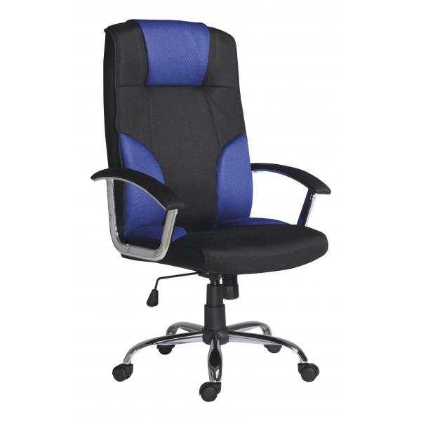 Kancelárske kreslo, vysoké operadlo, hojdací mechanizmus s aretáciou a nastaviteľnou silou protiváhy, oceľové podrúčky s čalúnením, oceľová chrómová báza, kolieska priemeru 50mm pre mäkké podlahy. Nosnosť 120 kg, záruka 24 mesiacov. Farebné kombinácie: šedá - čierna, modrá - čierna, bordó - čierna.