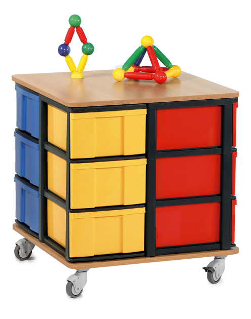 Praktické vozíky do tried a kabinetov na prehľadné odkladanie učebných pomôcok, hračiek, športových potrieb, úborov, dokumentov. Obsahujú kontajnerový systém InBox, ktorý vyniká svojou variabilitou, farebnosťou, praktickosťou. Korpus vozíkov je vyrobený z laminovanej drevotrieskovej dosky 18 mm hrúbky rôznych dezénov. Ohranené sú 2 mm ABS hranami. Farby Inbox krabíc sú priehľadná (vidieť obsah v boxe), červená, žltá, zelená. Vozík je na 4 kolieskach, 2 sú s brzdou.