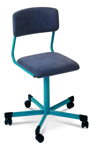 Metal construction made of tubular profile, with a lower five-arm cross with wheels and powder coating (assortment of 11 comaxit colours). The seat and the backrest are made of 7-coat full beech moulded plywood and cushioned by abrasion-resistant fabric of gray colour. The seat and the backrest are attached to the construction by metric screws M6. The chairs are not height-adjustable.