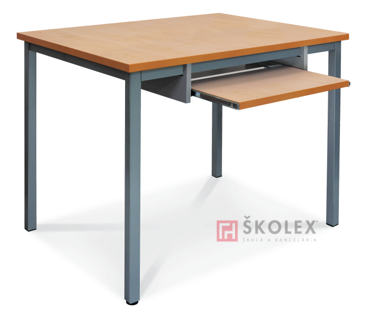 Metal construction is welded from square steel 35 x 35 mm, treated by comaxit colour. The desk feet are ended by plastic end pieces. There is one adjusting screw on one desk foot. The desk plate is made of 18mm LDT, melamine surface, attached to the construction by 4 metric screws M6 x 45mm. The desk plate edges are protected by 2mm ABS tape.