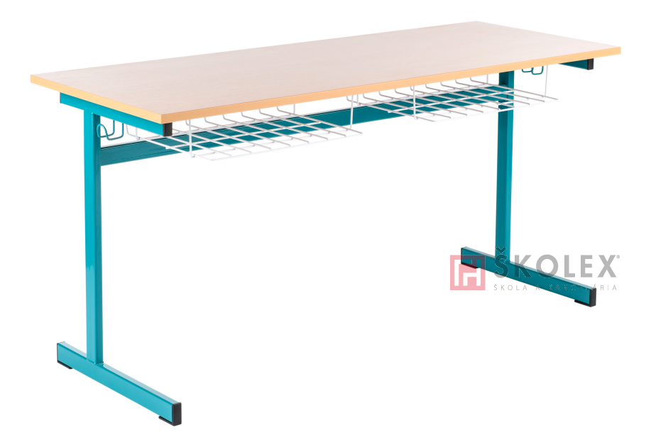 High-strength metal construction made of pipe profile 45 x 25 x 2 mm with powder coating of diverse colour shades. Desk feet are ended by plastic end pieces with large friction surface which absorb noise and do not cause damage to the floor. The desk can be put into a stabile position using adjusting screws. The working plate 130 x 50cm is made of 18 mm thick chipboard with melamine surface (beech 381), attached to the construction by 4 metric screws M6x45mm. Edges of desk plate are protected by 2mm thick ABS tape. 2 hangers for bags. SAXANA wood chairs, teacher´s desks TAU and teacher´s cushioned chairs LILY go well with school desks TAU.
