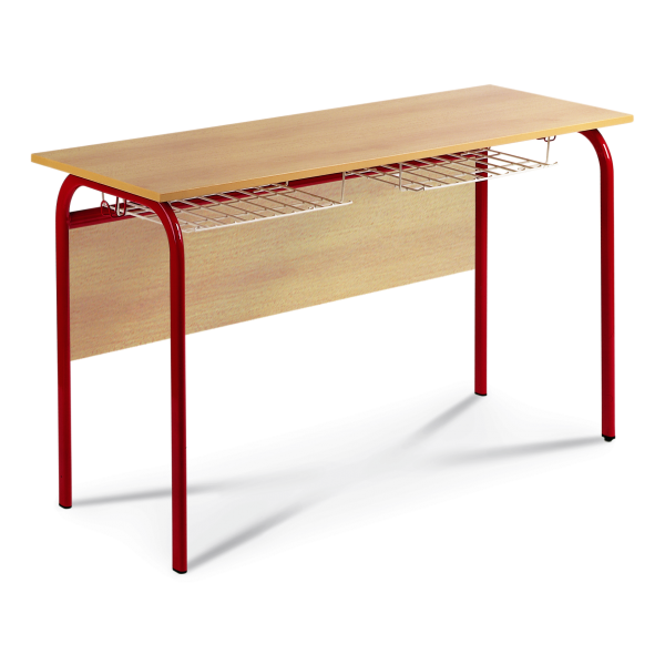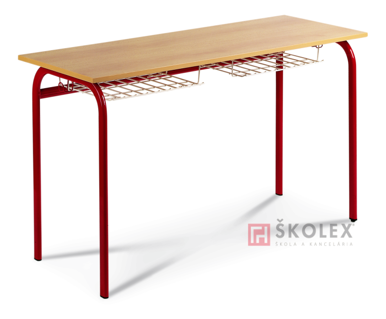 High-strength metal construction made of pipe profile 38 x 20mm with powder coaring of diverse colour shades. Desk feet are ended by plastic end pieces with large friction surface, which absorb noise and do not cause damage to the floor. One desk leg contains an adjusting screw for setting up the desk into a stabile position (to compensate floor unevenness). Working plate 130 x 50cm is made of 18mm thick chipboard with melamine surface (beech 381), attached to the construction with 4 metric screws M6x45mm. Edges of desk plate are protected by 2mm thick ABS tape. The storage compartment is designed as hygienic (anti-dust) wire basket lacquered by comaxit colour. There are 2 hangers for bags. SOKRATES chairs, school desks LUX or UNO and teacher´s cushioned chairs SOKRATES go well with this type of desk.
