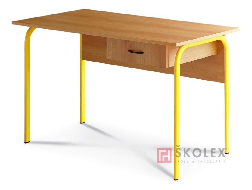 High-strength metal construction made of pipe profile 38 x 20mm, with powder coating of diverse colours. The feet are ended by plastic end pieces with large friction surface, which absorb noise and do not cause damage to the floor. The working plate 130 x 65cm and the front protective plate 130 x 35cm are made of 18 mm thick chipboard with melamine surface (beech 381) and attached to the construction by 4 metric screws M6 x 45mm. Desk edges are protected by 2mm ABS tape. The corners are rounded, the storage compartment is designed as extensible drawer of 40cm width on the right side of the desk. Teacher´s chair SOKRATES cushioned, school desk LUX, CEZAR or UNO and school chair SOKRATES go well with this type of desk.